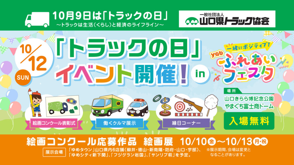 山口県トラック協会では、来る10月12日(日)にyabふれあいフェスタ内で下記イベントを開催いたします。